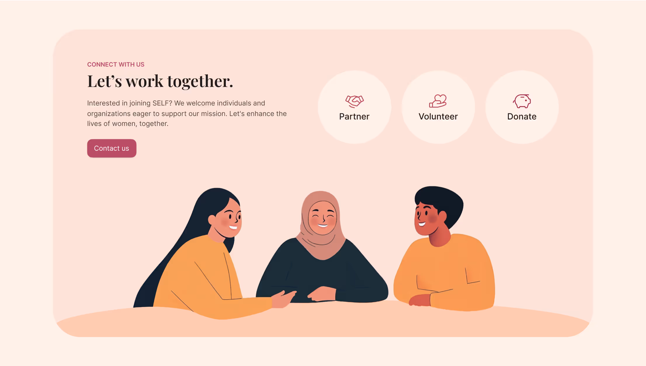 I first designed the CTAs to focus on contacting SELF for collaboration, but testing showed users didn’t realize they could also partner, volunteer, or donate. I added secondary CTAs for each option to make these paths clearer.